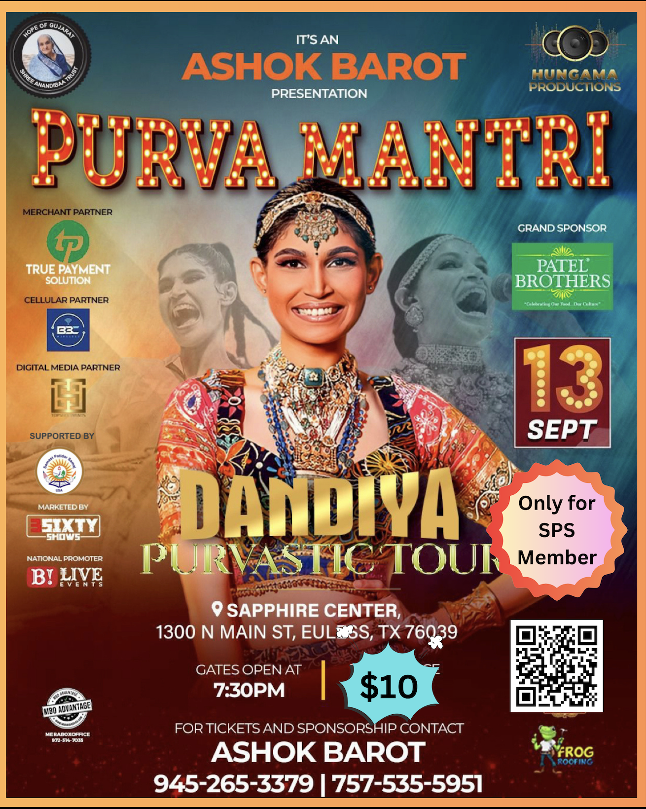 🎤 Dandiya Purvastic Tour with Purva Mantri📅 Saturday, September 13, 2025 | ⏰ Gates open at 7:30 PM📍 Sapphire Center, 1300 N Main St, Euless, TX 76039